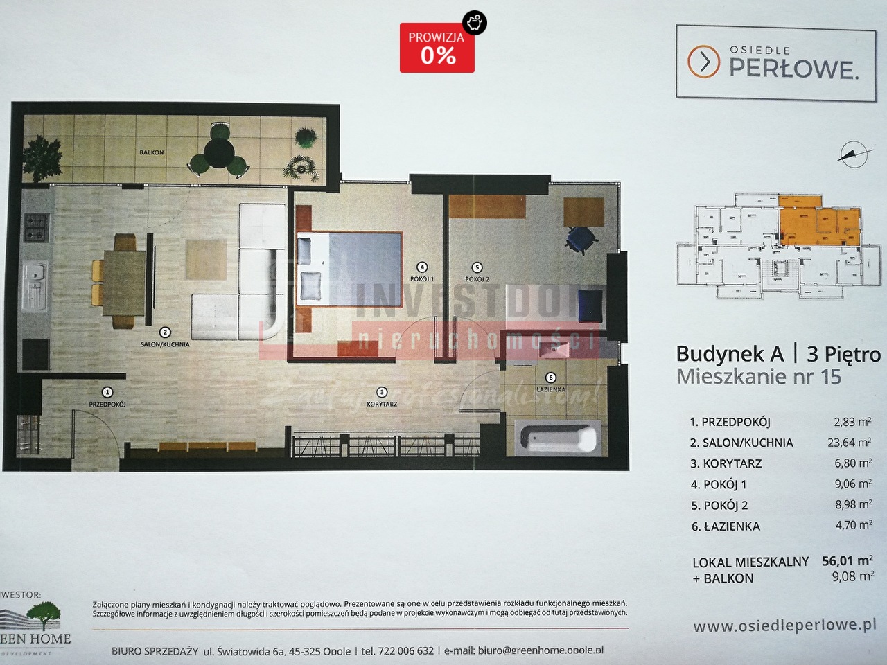 UWAGA! Kupujący nie płaci prowizji! Oferujemy do sprzedaży nowe, atrakcyjne, jasne i przestronne mieszkanie 3 pokojowe w nowo wybudowanym budynku mieszkalnym (rok budowy 2017) w Opolu Czarnowąsach. Mieszkanie w stanie deweloperskim do wykończenia, wyposażone w media wodno-kanalizacyjne, instalacje elektryczne, ciepłą wodę oraz ogrzewanie ciepłem z Elektrowni Opole, instalację telefoniczną, telewizyjną, internetową oraz domofonową. Lokal składa się obecnie z przedpokoju, salonu z kuchnią (aneks), korytarza, 2 sypialni i łazienki o łącznej powierzchni użytkowej 56,01 m2. Mieszkanie przygotowane jest do wykonania w nim antresoli z dodatkową sypialnią o powierzchni użytkowej ok. 30 m2. Projekt aranżacji antresoli dostępny jest do wglądu w siedzibie naszej firmy. Podana w ogłoszeniu powierzchnia mieszkania 86 m2 to powierzchnia użytkowa mieszkania wraz planowaną antresolą. Mieszkanie posiada ładny, duży balkon o powierzchni 9,08 m2. Do lokalu przynależy także piwnica o powierzchni 10,93 m2 oraz zewnętrzne miejsce postojowe przed budynkiem. Podana cena dotyczy sprzedaży mieszkania, piwnicy oraz miejsca parkingowego. Mieszkanie znajduje się w spokojnej dzielnicy Czarnowąsów, wokół domki jednorodzinne. Nieruchomość bardzo dobrze skomunikowana - dojazd do centrum miasta 2 autobusami komunikacji miejskiej MZK, w pobliżu szkoła, przedszkole, apteka, sklepy spożywcze, kościół. UWAGA! Kupujący nie płaci prowizji! Zapraszam do kontaktu oraz bezpośredniej prezentacji oferty: Grzegorz Karcz (licencja zawodowa nr 22483) tel. 512 248 858, e-mail: g.karcz@investdom.pl. W ramach oferty pomagamy także w uzyskaniu korzystnego kredytu na zakup nieruchomości. Więcej ofert na stronie www.investdom.pl. Opis powyższej oferty został sporządzony na podstawie oględzin nieruchomości oraz informacji uzyskanych od właściciela. Może on podlegać aktualizacji i nie stanowi oferty w rozumieniu w art. 66 i następnych K.C.