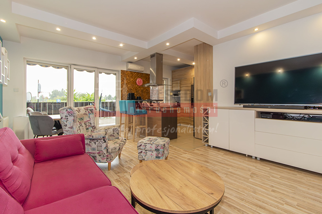 - salonu z aneksem kuchennym z wyjściem na słoneczny i obszerny taras, na którym znajdują się meble ogrodowe oraz markiza , która może osłaniać całą powierzchnię tarasu .