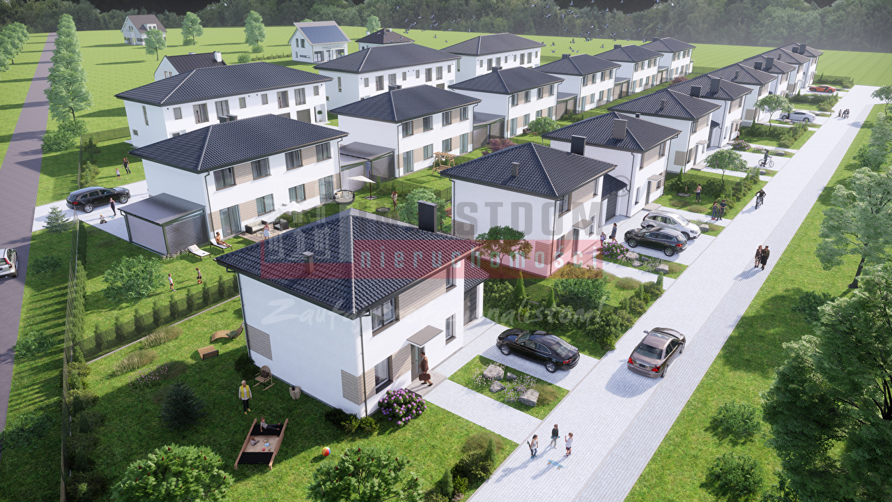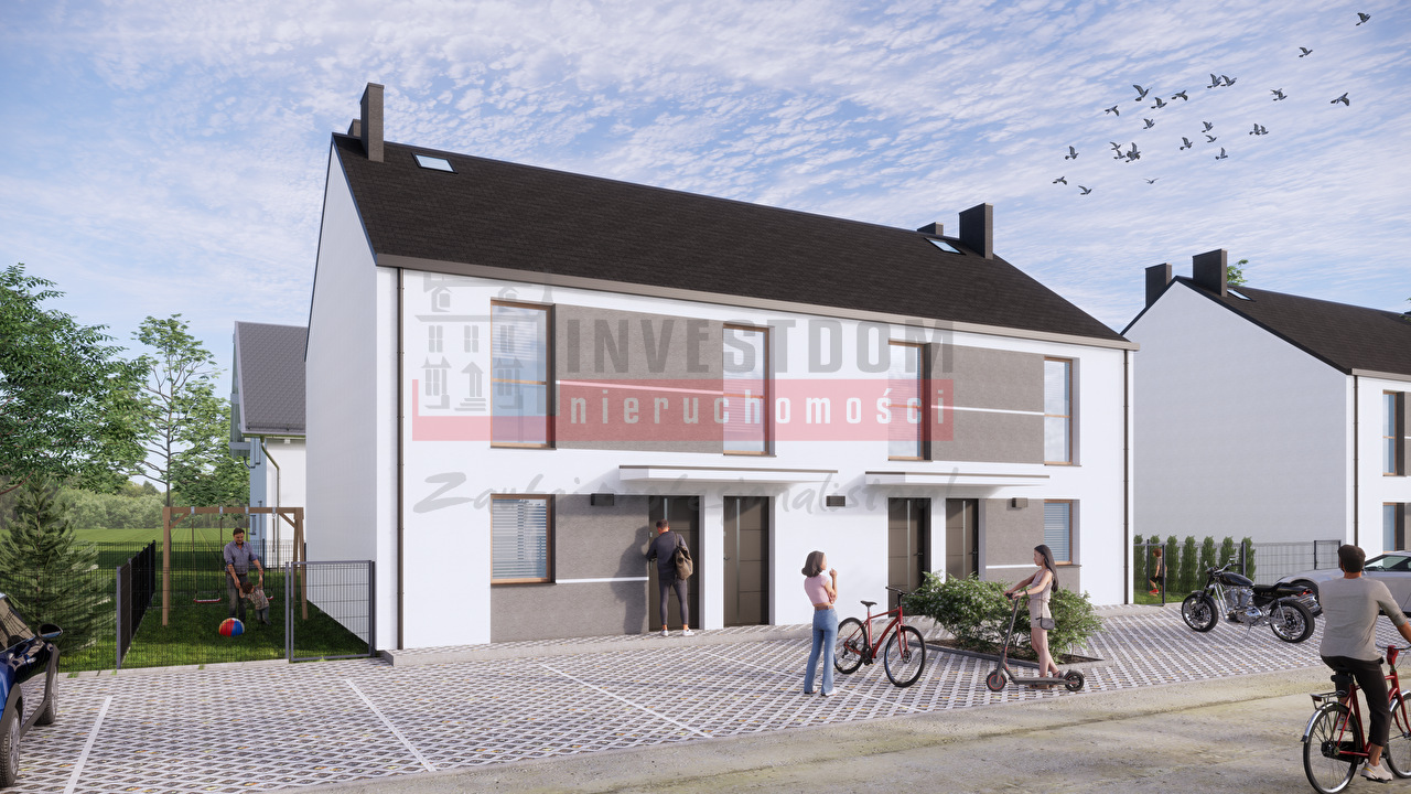 Budynek będzie budowany w technologii tradycyjnej, tzn. ściany murowane z pustaków ceramicznych o szerokości 25 cm, ocieplone styropianem o grubości 20 cm, strop gęstożebrowy Teriva, pokrycie dachu dachówką ceramiczną. Zakres prac wykończeniowych w budynku: ściany działowe murowane, na ścianach tynki gipsowe nakładane maszynowo, posadzki cementowe, ocieplone styropianem podłogowym, ogrzewanie podłogowe rozprowadzone na całym budynku, okna trzyszybowe, ramy pięciokomorowe wykonane z PCV, parapety zewnętrzne aluminowe, drzwi wejściowe do budynku stalowe. Instalacja elektryczna wg projektu zakończona łącznikami i gniazdami. Budynki będą podłączone do sieci gazowej. Przed wejściem do domu zostanie ułożona kostka. Dojazd drogą asfaltową. Miejsca parkingowe dodatkowo płatne.