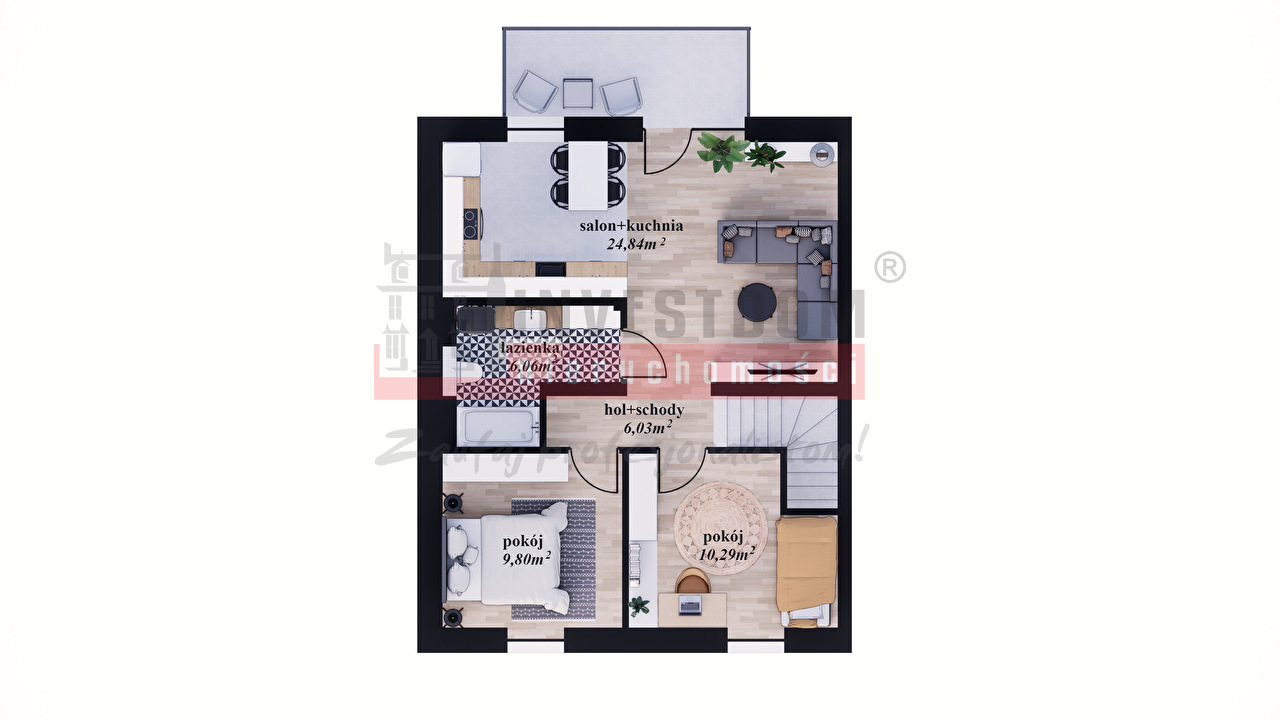 Oferta dotyczy mieszkania usytuowanego na piętrze. Powierzchnia użytkowa lokalu to 61,62m2, na którą będą składać się następujące pomieszczenia: wiatrołap (4,60m2), salon z kuchnią (24,84m2), balkon, dwie sypialnie (9,80m2 i 10,29m2), łazienka z toaletą (6,06m2) oraz hol + schody (6,03m2).